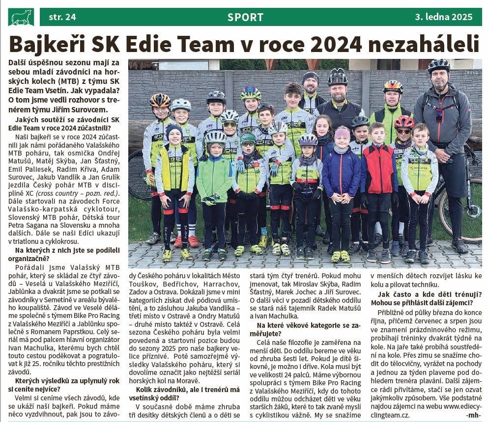 SK EDIE CYCLING TEAM VSETÍN Stránky sloužící pro propagaci, informace a zviditelnění cyklistického oddílu dětí spolku SK EDIE TEAM VSETÍN, který pořádá závody MTB XC Valašského poháru. Činnost SK EDIE TEAM Vsetín, z. s. je spolufinancována Zlínským krajem.