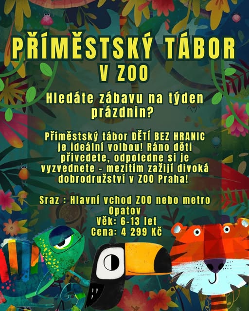 🦁🌿 PŘÍMĚSTSKÝ TÁBOR V ZOO – TÝDEN PLNÝ DOBRODRUŽSTVÍ! 🦒🐾 Potřebujete vyplnit týden prázdnin? Příměstský tábor DĚTÍ BEZ HRANIC zajistí dětem nezapomenutelné chvíle mezi zvířaty! 🐵✨ Ráno je přivedete, odpoledne vyzvednete – a mezitím? Spousta zábavy v ZOO Praha! 📍 Sraz: Hlavní vchod ZOO nebo metro Opatov 📅 Věk: 6–13 let 💰 Cena: 4 299 Kč Rezervujte místo dřív, než uteče jako gepard! 🏃♂️💨 #primestskytabor #tydenvzoo #detibezhranic #letosdivocinou (fb)