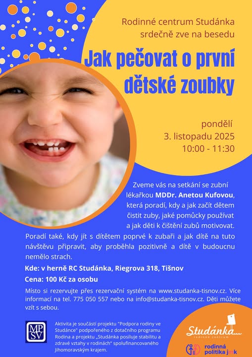 Kdy a jak začít čistit první zoubky? Jak děti k čištění zoubků motivovat? Na tyto a další otázky spojené s prvními zoubky odpoví zubní lékařka MDDr. Aneta Kufová již příští pondělí 3. listopadu 2025 od 10:00 ve Studánce. Na setkání je nutné přihlásit se předem na https://www.studanka-tisnov.cz/. (fb)