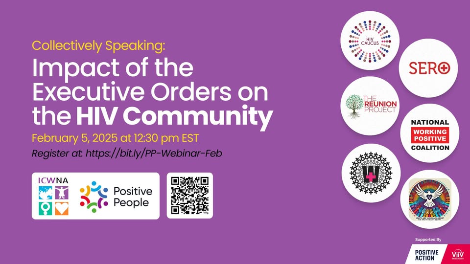 Join us for a Webinar on: The Impact of the Executive Orders on the HIV Community! The webinar will explore how the recent executive orders might affect people living with or impacted by HIV. We'll break down the implications for healthcare access, stigma reduction, and community support. This session is open to all and aims to empower attendees with knowledge and resources. DATE: Wednesday, February 5, 2025 TIME: 12:30 - 2:00 PM EST REGISTRATION LINK: https://bit.ly/PP-Webinar-Feb The Webinar is presented by International Community of Women Living with HIV - North America & Positive People. The webinar is co-sponsored by U.S. PLHIV Caucus, The SERO Project, Positive Women's Network - USA, The Reunion Project, National Working Positive Coalition, AIDS United, and Unity Arc Advocacy Group. The Panel will include representatives from these organizations who will be equipped to answer questions and provide practical resources and support. This event is also supported by ViiV Healthcare as part of the Positive Action for Women initiative. #hivawareness #EndHIVStigma Learn more and register at: https://bit.ly/PP-Webinar-Feb (fb)