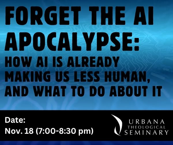 Dr. Todd Daly Forget the AI Apocalypse: How AI Is Already Making Us Less Human, and What to Do about It November 18, 2025 Friends Conference Room 215 (Champaign Public Library. 200 W Green St, Champaign) The specter of Artificial super Intelligence gaining consciousness and enslaving or destroying humans is a dominant feature of AI discourse, but AI is already threatening our humanity in the form of AI chatbots. How should Christians respond to the advent of AI companions? (fb)