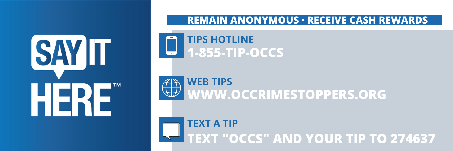 Orange County Crime Stoppers encourages members of the community to assist local law enforcement agencies in the fight against crime by overcoming the two key elements that inhibit community involvement: fear and apathy. The Orange County Crime Stoppers program (OCCS) helps resolve, reduce and prevent crime by enabling citizens to safely report criminal activity to law enforcement through anonymous crime tips. OC Crime Stoppers is a 501(c)(3) non-profit organization that works in partnership with the community, the media and law enforcement to facilitate the sharing of valuable tips that will hopefully reverse cold cases and all unresolved crimes to help create a safer community.