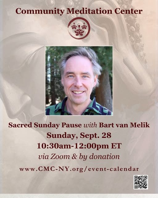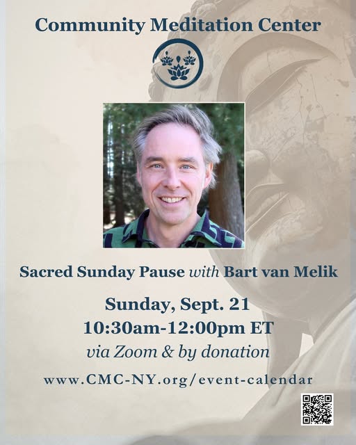 Whose voices help you return to balance when life feels out of rhythm? This Sunday we’ll turn toward equanimity - a heart quality that expands our view. It allows us to be less disturbed by pain, blame, or loss, and less intoxicated by pleasure, praise, or gain. A steady heart that keeps kindness, compassion, and joy grounded. A question we’ll explore together: What do I trust when there is equanimity? 🧘 Join us online with Community Meditation Center to explore equanimity through practice and reflection. 🗓 Sunday, Sept 28, 2025 ⏰ 10:30am–12pm ET | 16:30–18:00 CET @cmcnewyork 📍 Zoom (link in bio or www.CMC-NY.org/event-calendar) ✨ By donation – all are welcome. #Equanimity #FourHeartQualities #Mindfulness #Dharma #CommunityMeditationCenter #SacredSundayPause #WisdomInAction #Community (fb)