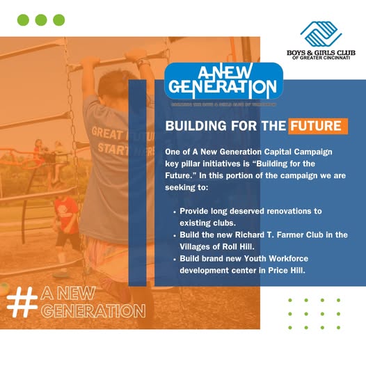 One of the key missions of A New Generation Capital Campaign is to expand our impact through renovations and building new Club locations so that we can continue to provide safe spaces within our communities. Help us reach our $50 million goal and donate today at bgcgc.org/capitalcampaign #BoysandGirlsClub #GreaterCincinnati #ANewGeneration #DonateNow (fb)