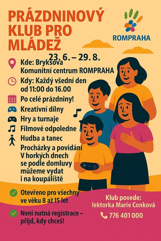🎉 PRÁZDNINOVÝ KLUB STARTUJE již od 23.6.2025! 📍 Komunitní centrum RomPraha, Bryksova 40, Černý Most 🕚 Každý všední den 11–16 h 🎮🎨🎬🎶 ✅ Pro děti 8–15 let ✅ Bez registrace 📞 Info: 776 401 000 👩 Klub vede Marie Conková 👉 Přijď kdykoli! 💥 Tohle léto bude stát za to – dorazíš? #prázdniny #KomunitníCentrum #RomPraha #leto2025 #klubpromladez (fb)