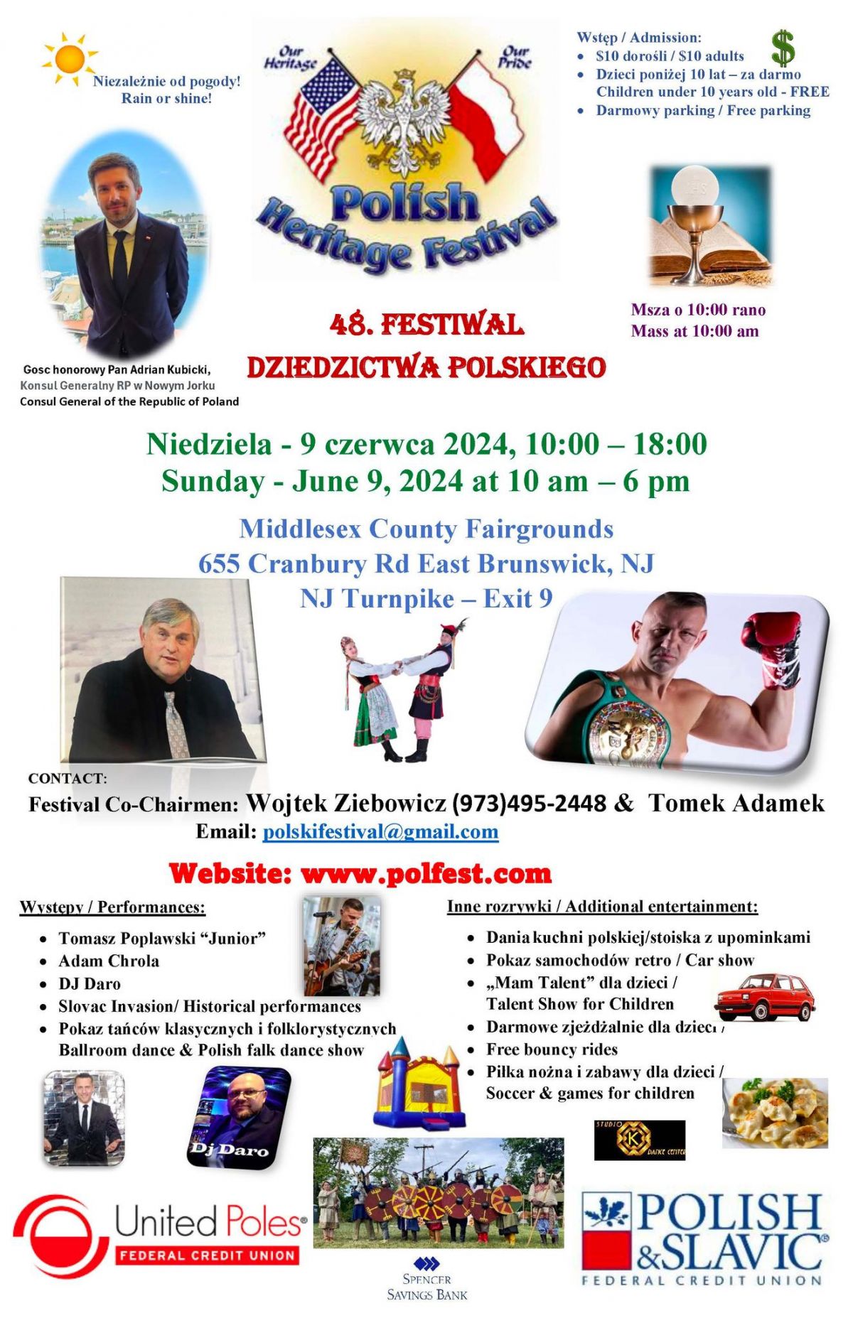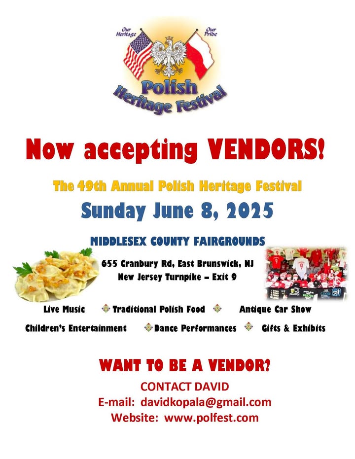 Polish Heritage Festival June 9th 2024 East Brunswick NJ Festival 2024 PLEASE JOIN US 48th Annual Polish Heritage Festival on Sunday June 9th 2024 at Middlesex County Fairgrounds655 Cranbury RoadEast Brunswick NJ 08816New Jersey Turnpike Exit 9Directions Live musicTraditional Polish foodAntique Car ShowChildrens entertainmentDance performancesGifts and exhibitsPolish vendor marketplace FOOD PERMIT FIRE PERMIT FIRE PERMIT PACKAGE AD JOURNAL AD RATES SCHOLARSHIP APPLICATION Deadline has ended. Check back next year. Share this 14 thoughts on Festival 2024 It was success. so many great stands so many People cars.