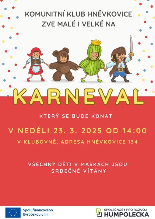 Komunitní klub Hněvkovice zve zájemce o členství v komunitním klubu na nedělní dětský karneval. Přijďte si užít odpoledne plné zábavy, her, tance a překvapení! 🎭✨ (fb)