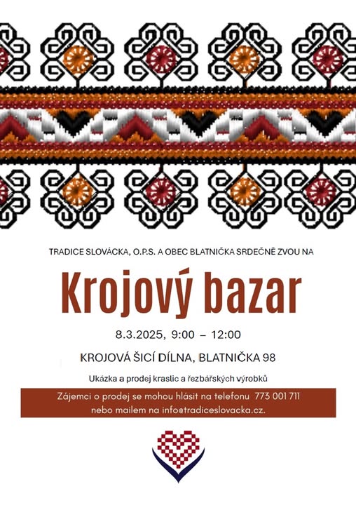 Zájemci o prodej na krojovém bazaru 8.3.2025 se můžete hlásit na mail info@tradiceslovacka.cz, nebo telefon 773 001 711 (fb)
