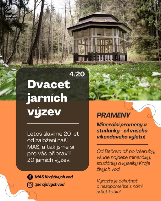 PRAMENY – ŽIVÁ VODA NA DOSAH 💦 Vydejte se za minerálními prameny a studánkami, které jsou rozeseté po celém našem kraji! Od Bečova až po Všeruby – všude můžete narazit na osvěžující kyselky, skryté studánky i léčivé minerálky. Naplánujte si víkendový výlet a objevte prameny Kraje živých vod! 🚶♀️ Nezapomeňte na fotku – podělte se s námi o své objevy v komentářích nebo nás označte ve svém příspěvku! 📸 Který pramen je váš oblíbený?💧 O fotce: na fotce vidíte zachycený Reitenbergerův pramen, který se nachází nedaleko kouzelného městečka Úterý. Pramen byl pojmenován na počest úterského rodáka a zakladatele Mariánských Lázní - Karla Kašpara Reitenbergera. Altánek byl v nedávných letech naší MASkou obnoven, o jeho historii a dalších informací se budete moci dozvědět na informačním panelu. Jedná se o krásné a klidné místo na výlet. Voda je zde pitná🌲 --- 20 jarních výzev Kraje živých vod🌿 Letos slavíme 20 let od založení naší MAS, a tak jsme si pro vás připravili 20 jarních výzev. Na našich sociálních sítích budeme zveřejňovat nové úkoly, které vám umožní prozkoumat krásy našeho regionu a nejen to! Těšit se můžete na fotovýzvy, dobrovolnické výzvy, výlety a kreativní úkoly – to vše s cílem oslavit náš region a jeho bohatou historii🧡 Na nejaktivnější účastnice a účastníky bude na konci března čekat odměna! Buďte s námi, sdílejte své zážitky, fotky a příběhy a nezapomeňte, že čím více úkolů splníte, tím větší šance máte na výhru. 📌 Sledujte nás a zapojte se do našich oslav! (fb)