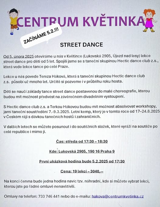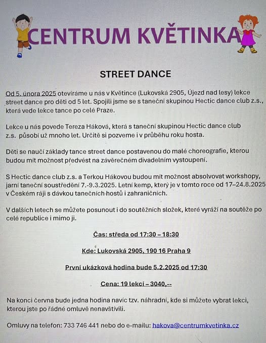 Centrum Květinka - LUKAVSKÁ - ÚJEZD NAD LESY- ZAČÍNÁME JIŽ TUTO STŘEDU 5.2.2025 !!!STREET DANCE PRO DĚTI OD 5 LET!!! JEŠTĚ MOŽNOST PŘIHLÁŠENÍ!!! PŘIJĎTE VYZKOUŠET! TĚŠÍME SE NA VÁS 🎉🎉🎉 (fb)