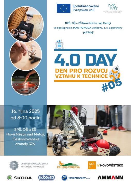⏰Přípravy na "4.0Day- Den pro rozvoj vztahu k technice" jsou v běhu. 🤩Těšíme se na žáky a děkujeme za spolupořádání dalšího ročníku zapojeným subjektům Střední průmyslová škola, Odborná škola a Základní škola, Nové Město n.Met., Škoda, Ammann Group, ATAS elektromotory Náchod a.s. a Hronovský Group. (fb)