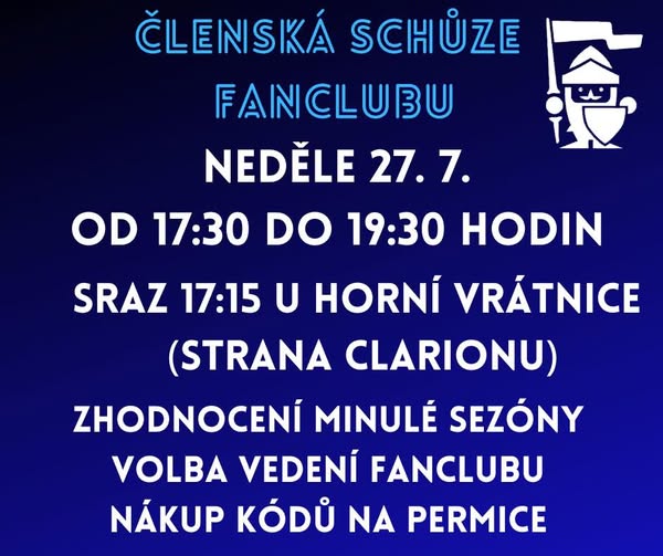 Informace o členské schůzi! Vítkovičtí, členská schůze Fanclubu se uskuteční v neděli 27. 7. Proběhne volba vedení, současní členové můžou vrátit permici pro vyplacení zálohy a dojde k prvnímu prodeji kódů pro koupi permice. Připomínáme, že přecházíme na permice v aplikaci Moje Vítky. Těšíme se na všechny stálé i nové členy 💙 Poté budou samozřejmě následovat další termíny prodeje kódů. (fb)