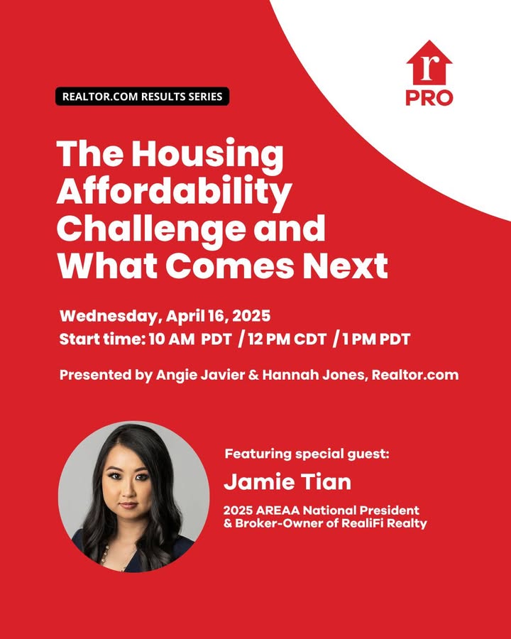 This is a special presentation featuring industry experts: Hannah Jones, Senior Economic Research Analyst at Realtor.com and Jamie Tian, Broker-Owner of RealiFi Realty and our 2025 AREAA National President. Housing affordability and supply are at a breaking point—what does this mean for real estate professionals, and how can you prepare for what’s ahead? Join us for an eye-opening discussion featuring industry experts who will unpack the factors driving the housing crisis and the potential solutions that could create more opportunities for buyers and sellers. We’ll also explore Realtor.com’s Let America Build campaign, a bold initiative launched at SXSW to address inventory shortages and affordability challenges nationwide. Sign up today to save your spot and we'll see you on April 16th. https://realtor.zoom.us/webinar/register/1817435264021/WN_8_Lxgdy5R662Fc74wjiV2w#/registration #AREAA #REALTORDOTCOM (fb)