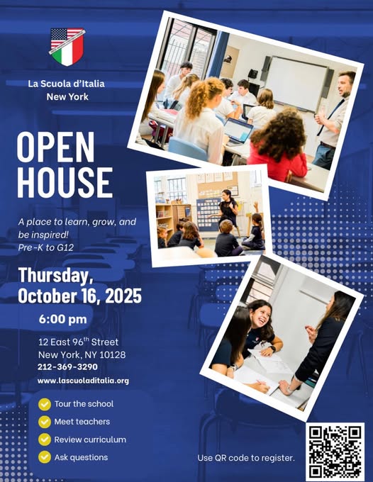🌟 Discover a place to learn, grow, and be inspired! 🌟 Join us for La Scuola d’Italia New York’s Open House ✨ 📚 Explore our vibrant classrooms 🤝 Meet our dedicated teachers 📖 Learn about our Pre-K to G12 bilingual curriculum ❓ Ask questions and find out why La Scuola is the perfect place for your child’s journey! 📅 Thursday, October 16, 2025 ⏰ 6:00 pm 📍 12 East 96th Street, New York, NY 10128 🔗 Scan the QR code to register today! #LaScuoladItalia #OpenHouseNYC #BilingualEducation #FutureStartsHere #NYCEvents #PreKtoG12 (fb)