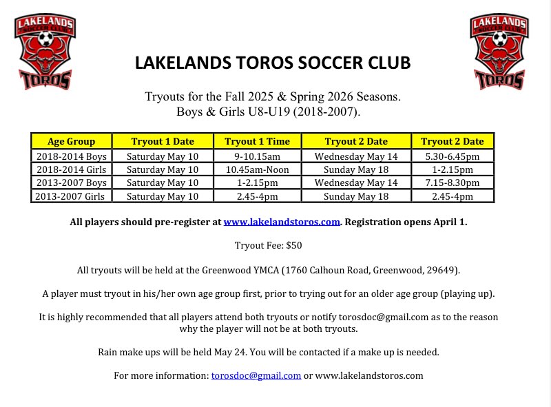 Fall 2025/Spring 2026 Tryout Schedule! Pre-register for your tryout at www.lakelandstoros.com #lakelandstoros #toros ⚽️🔴⚽️🔴⚽️ (fb)
