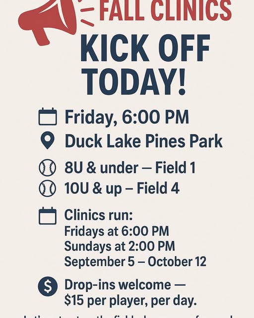 📣 Fall Clinics Kick Off Today! 🗓 Friday, 6:00 PM 📍 Duck Lake Pines Park ⚾ 8U & under – Field 1 ⚾ 10U & up – Field 4 Clinics run: 📅 Fridays at 6:00 PM & Sundays at 2:00 PM 📆 September 5 – October 12 💲 Drop-ins welcome — $15 per player, per day. Let’s get out on the fields, have some fun, and grow our skills together! We can’t wait to see everyone out there! 💙⚾ (fb)