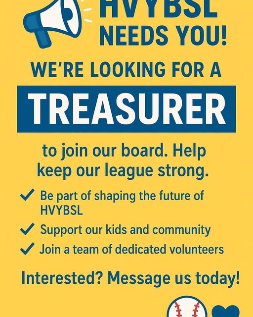 📣 HVYBSL Needs You! We’re currently searching for a dedicated Treasurer to join our board. This is a vital role to help keep our league running smoothly for all our players and families. ✅ Be part of shaping the future of HVYBSL ✅ Support our kids and community ✅ Join a great team of volunteers If you’re interested or would like more details, please reach out—we’d love to have you on board! ⚾💛💙 (fb)