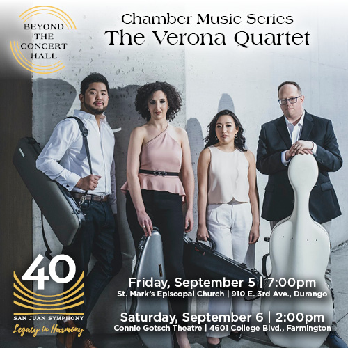 The San Juan Symphony’s 40th Season kicks off with the world-renowned Verona Quartet! Durango – Fri, Sept 5 | 7pm | St. Mark’s Episcopal Church Farmington – Sat, Sept 6 | 2pm | Connie Gotsch Theater Praised by The New York Times as an “outstanding ensemble, full of temperament,” the Verona Quartet brings a program that’s dazzling, romantic, and unforgettable. From Gershwin’s Lullaby to the brilliance of Shostakovich and Ravel, this is chamber music at its finest. Tickets on sale now – don’t miss this Beyond the Concert Hall season opener! www.sanjuansymphony.org #SJS40 #VeronaQuartet #BeyondTheConcertHall #DurangoCO #FarmingtonNM #ChamberMusic #legacyinharmony (fb)