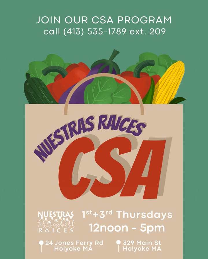 Join the Nuestras Raíces CSA! Get fresh, local, and culturally relevant produce straight from our farm to your table — grown with care by farmers from right here in our community. Our farm is home to local growers who cultivate crops that reflect the rich cultures and traditions of the communities we serve. We offer two CSA box options delivered twice a month: 📦 Small Box: $60/month 📦 Large Box: $90/month 💳 We accept SNAP, cash, and credit cards. CSA Pick-Up Details: 🗓️ Every 1st & 3rd Thursday of the month ⏰ 12 PM – 5 PM Pick-Up Locations – Choose what’s easiest for you! 📍 329 Main Street, Holyoke, MA 01040 📍 24 Jones Ferry Road, Holyoke, MA Enjoy the convenience of two pick-up spots right in the heart of Holyoke! Support local agriculture, nourish your family, and celebrate culture through food — all with the Nuestras Raíces CSA. 📞 To join or for more information on the CSA, call us at (413) 535-1789 x209. 🌐 To learn more about our programs and offerings, visit www.nuestras-raices.org — ¡Únete al CSA de Nuestras Raíces! Recibe productos frescos, locales y culturalmente relevantes, directo de nuestra finca a tu mesa — cultivados con dedicación por agricultores de nuestra propia comunidad. Nuestra finca es el hogar de agricultores locales que siembran cultivos que reflejan las ricas culturas y tradiciones de las comunidades a las que servimos. Ofrecemos dos opciones de cajas CSA que se entregan dos veces al mes: 📦 Caja pequeña: $60/mes 📦 Caja grande: $90/mes 💳 Aceptamos SNAP, efectivo y tarjetas de crédito. Detalles del CSA: 🗓️ Todos los primeros y terceros jueves del mes ⏰ 12 PM – 5 PM Lugares de recogido – ¡Elige el que te quede más cómodo! 📍 329 Main Street, Holyoke, MA 01040 📍 24 Jones Ferry Road, Holyoke, MA ¡Disfruta la conveniencia de dos lugares de recogido en el corazón de Holyoke! Apoya la agricultura local, alimenta a tu familia y celebra la cultura a través de la comida — todo con el CSA de Nuestras Raíces. 📞 Para inscribirte o para más información sobre el CSA, llámanos al (413) 535-1789 x209. 🌐 Para conocer más sobre nuestros programas y servicios, visita www.nuestras-raices.org (fb)