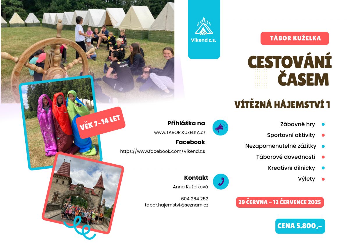 Chtěli byste navštívit pravěk, středověk, nebo se podívat do vzdálené budoucnosti? Připojte se k nám na nezapomenutelný letní tábor s tématem Cestování časem, kde vás čeká vzrušující dobrodružství napříč časovými obdobími! ⏳✨ S táborem Kuželka zažijete 14 dní plných her, dobrodružství a nových přátelství v klidné lokalitě obce Hájemství v Podkrkonoší. 🏕️ Neváhejte a přihlaste se na stránkách: https://tabor.kuzelka.cz/prihlaska/ (fb)