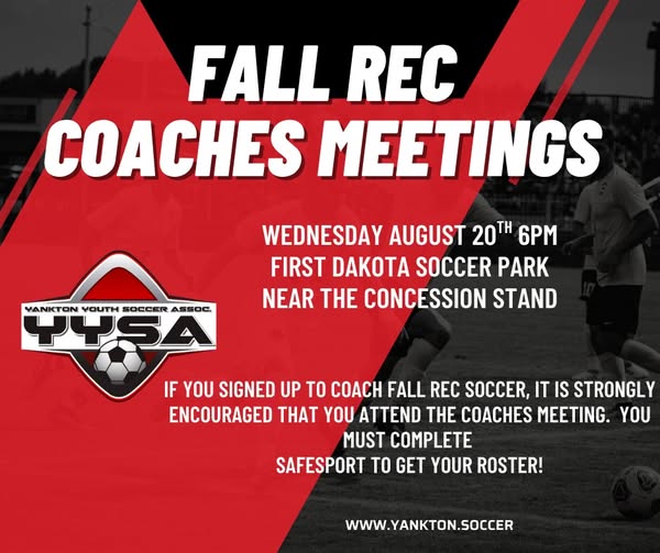 Website Manager Yankton Youth Soccer Association Yankton Youth Soccer Association Spring Rec Registration No Pets Allowed Spring Invitational Fall Invitational River City Rumble News Give us 110 Join us. Join us. Become a REF. The grand opening date is now TBD.