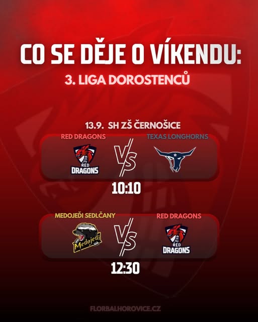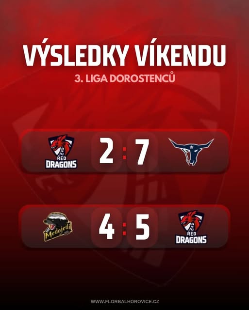 VÝSLEDKY VÍKENDU: Dorostenci vyjeli na svůj první turnaj v sezóně. První zápas proti Texas Longhorns však nezvládli a odešli z něj s prohrou. Druhý zápas proti Medojedům skončil pro Draky dobře a po napínavých třech třetinách zvítězili 5:4. (fb)