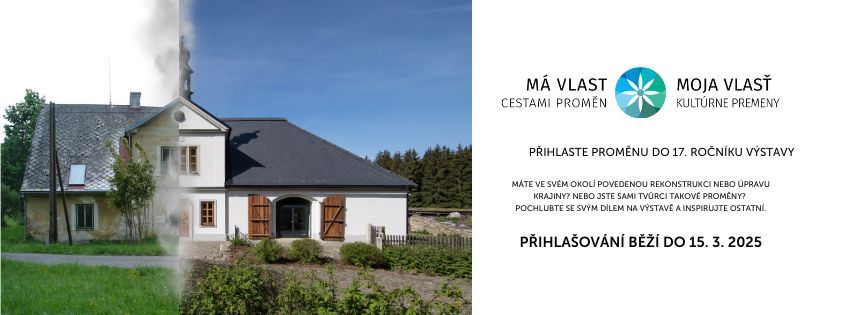 MOHELNICE-PODOLÍ | ZÁCHRANA RENESANČNÍ KOBYLKOVY TVRZE ŽELEZNÁ RUDA | KLOSTERMANNOVO NÁMĚSTÍ VALAŠSKÉ KLOBOUKY | DŮM NA ROHU Putovní celoroční česko-slovenská výstava Má vlast cestami proměn – příběhy domova přináší dobré zprávy o zdařilých proměnách měst, vesnic a krajiny. Děkuje autorům proměn – investorům, projektantům, realizátorům, a obdivuhodným a nenahraditelným místním nadšencům. Slouží jako cenný zdroj kontaktů na autory projektů a realizátorů kvalitních rekonstrukcí. Zabývá se širokým spektrem objektů od velkých komplexů po drobné stavby a sochařské prvky v sídlech a krajině.