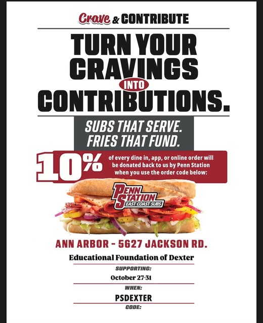 We love seeing new businesses jump right in to support Dexter students! Penn Station East Coast Subs may be new to town, but they’re already showing what it means to be a great neighbor. From October 27-31 stop by, show this flyer, or order online or in the app with the code and a portion of your purchase will help the Educational Foundation of Dexter fund classroom grants and teacher innovation! (fb)