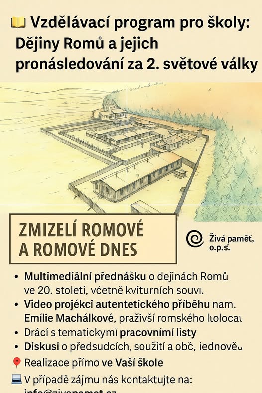 📚 Vzdělávací program pro školy: Dějiny Romů a jejich pronásledování za 2. světové války Obecně prospěšná společnost Živá paměť nabízí školám bezplatný vzdělávací program Zmizelí Romové a Romové dnes, který přibližuje dějiny Romů v Česku a Evropě a tragické události romského holocaustu. Program je určen pro žáky 2. stupně ZŠ a studenty středních škol. 🎓 Co program zahrnuje? • Multimediální přednášku o dějinách Romů ve 20. století, včetně kulturních souvislostí • Video projekci autentického příběhu pamětnice Emílie Machálkové, přeživší romského holocaustu • Práci s tematickými pracovními listy • Diskusi o předsudcích, soužití a občanské odpovědnosti 🕒 Délka programu: 90 minut 📌 Realizace přímo ve Vaší škole 💸 Program je zdarma díky podpoře Ministerstva školství, mládeže a tělovýchovy ČR 📩 V případě zájmu nás kontaktujte na: info@zivapamet.cz nebo napište zprávu do Messengeru. (fb)
