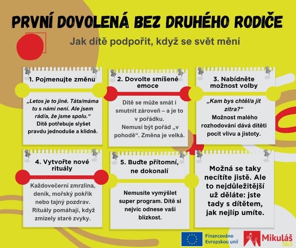 🎒 První dovolená bez druhého rodiče? Tahle infografika je pro všechny rodiče, kteří právě zažívají první dovolenou s dětmi v nové rodinné situaci. Nemusí být dokonalá. Důležité je, že jste tam pro své dítě – jak nejlíp umíte. Připravili jsme 5 jednoduchých tipů, jak dítě podpořit, když se všechno mění. Infografika navazuje na článek, který jsme na tohle téma napsali pro hlasditete.cz. 📖 Článek najdete tady: https://hlasditete.cz/aktuality/jedeme-spolu-poprve-bez-druheho-rodice 📌 Sdílejte, třeba se někomu z vašich přátel bude hodit. #hlasdítěte #esfplus #rodiče #rodina Příspěvky jsou součástí projektu Mikuláš pro rodinu, který je financován EU. (fb)