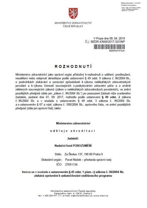 V minulém týdnu jsme od MZČR, po dvou letech, obdrželi akreditaci Certifikovaného kurzu - Psychosociální dovednosti pro nelékařské zdravotnické pracovníky neboli po našem Kontaktní sestra. Věříme, že akreditaci brzy zúročíme v zahájení kurzů samotných. Všem moc děkujeme za podporu! NF POROZUMĚNÍ http://www.porozumeni.cz/ (fb)