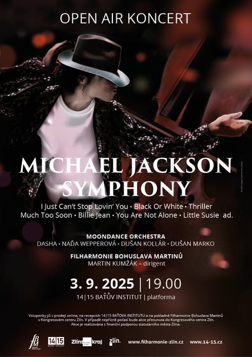 MICHAEL JACKSON SYMPHONY Na začátku září ožije platforma BAŤOVA INSTITUTU rytmy legendárního The King of Pop! Repertoár třináctinásobného držitele ceny Grammy poskytuje nekonečnou inspiraci, kterou se rozhodl využít dirigent Martin Kumžák. Vytvořil originální aranže několika Jacksonových hitů, které oživí čtyři talentovaní zpěváci – Dasha, Naďa Wepperová, Dušan Kollár a Dušan Marko, spolu s Moondance Orchestrem, jedním z nejlepších českých tanečních orchestrů a tradičním filharmonickým tělesem. Předprodej vstupenek na recepcích 14|15 Baťův Institut a v pokladně Filharmonie Bohuslava Martinů v Kongresovém centru Zlín. Vstupenky on-line zde: https://vstupenky.filharmonie-zlin.cz/filharmonie-zlin/standard/Hall/Index/1884/rUaPFeda3rM_rov__xcodex_AGA1gFbU4wihxcl_com_DBcx9GaluMT4l1GHueMqzw__? Vstupné 690,- Kč, děti do 6 let zdarma. Moondance Orchestra Martina Kumžáka DASHA (fb)