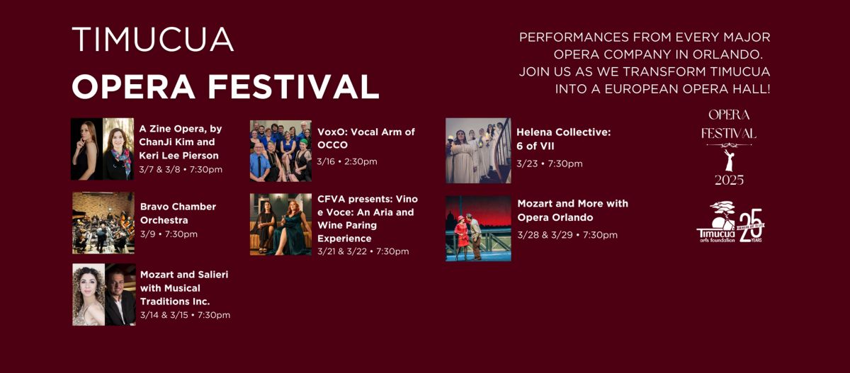 TIMUCUA ARTS FOUNDATION Opera Festival A Zine Opera by ChanJji Kim and Keri Lee Pierson Friday 37 Saturday 38 730pm The Zine Opera a chamber opera about Women by Women set in the worlds best living room concert hall transformed into a European opera house for the occasion. Join singer Keri Lee Pierson and pianist Sofia Cardi Bonfil as they tell the fictional story of Liz a 1990s historian working in the archives of a library and uncovering the stories of pioneering women featured in Fanzines. Opera Festival Bravo Chamber Orchestra Sunday 39 730pm The Bravo Chamber Orchestra is a subset of the Maitland Symphony. These musicians come from all walks of life and they get together every week to make music together led by Alvaro Gomez.