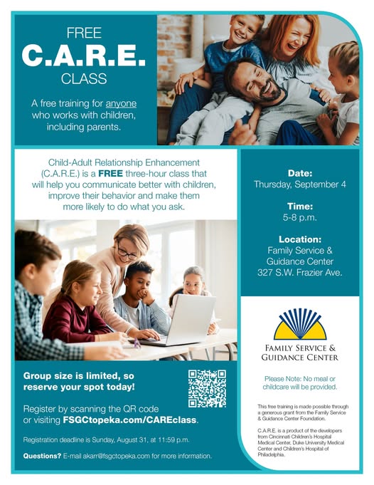What parent wouldn't like to see their kids' behavior improve? If you and your kids are at odds a lot of the time, consider signing up for our popular, FREE parenting training called CARE. CARE (Child-Adult Relationship Enhancement) is a one-session, three-hour course that will teach you how to communicate better with your kids. That improved communication carries a lot of benefits, like improved behavior. It will be offered Thursday, September 4, from 5-8 p.m., at our 327 SW Frazier building. The class is FREE, but group size is limited, so please sign up! CARE is well worth your time. The registration deadline is Sunday (August 31) at 11:59 p.m. Get all the details and sign-up by scanning the QR code or visiting FSGCtopeka.com/CAREclass today! (fb)