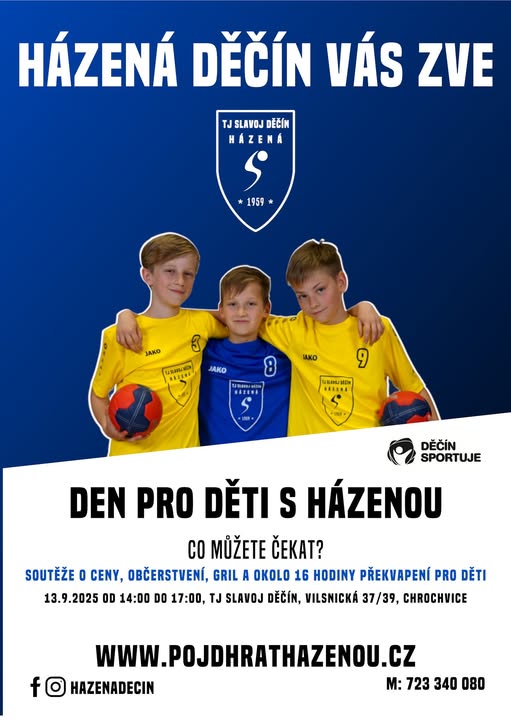 DEN PRO DĚTI S HÁZENOU Zveme vás na sportovní den pro děti s házenou, který se bude konat na Slavoji v sobotu 13. září od 14:00. #hazenadecin, #pojdhrathazenou, #decinsportuje (fb)