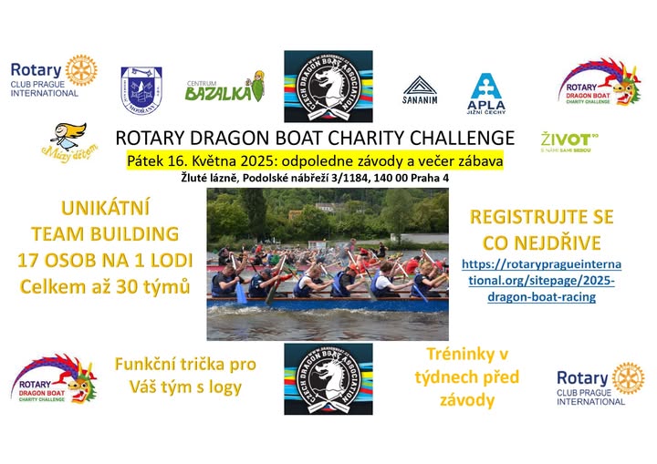 🐉Připojte se k ROTARY DRAGON BOAT CHARITY CHALLENGE! 📅 16. května 2025 | 📍 Žluté lázně, Praha 4 S radostí oznamujeme, že Modrý klíč byl vybrán mezi organizace, které tento dobročinný závod v dračích lodích podpoří! Děkujeme Rotary Club Prague International za dlouhodobé partnerství. 💙 💡 Jak se zapojit? ✅ Sestavte tým a závoďte! Registrace do 15. dubna. ✅ Přijďte fandit a užít si den plný zábavy! Výtěžek podpoří Modrý klíč a další neziskové organizace. Naše část pak půjde na projekt Hon na mamuta – sbírku na nový minibus, který usnadní dopravu našim klientům. 🚐💙 📌 Více info & registrace: https://rotarypragueinternational.org/sitepage/2025-dragon-boat-racing/the-2025-rotary-dragon-boat-charity-challenge (fb)