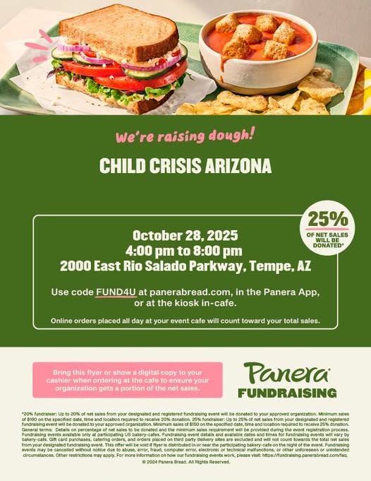 Enjoy your favorite meal today from 4–8 PM at Panera Bread -Tempe Marketplace and make a difference! Show this flyer at checkout—or use code FUND4U online, in the Panera app, or at a kiosk—and 25% of your purchase will benefit Child Crisis Arizona. #PaneraForACause #GiveBack #TempeEats (fb)