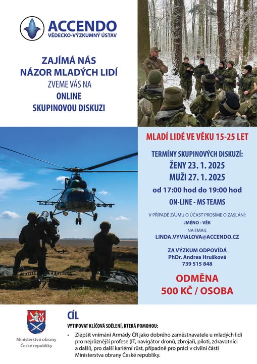 📣 ZVEME VÁS NA ONLINE SKUPINOVOU DISKUZI 💬 💵ODMĚNA: 500 KČ / OSOBA 🧔♂️👩🦰CÍLOVÁ SKUPINA ÚČASTNÍKŮ: MUŽI A ŽENY 15-25 let 🏷TÉMA: Práce v Armádě ČR 🪖, případně pro v civilní části Ministerstva obrany České republiky 🛡. 💻FORMA: ONLINE V PROSTŘEDÍ MS TEAMS 🗓TERMÍNY: 👩🦰ŽENY 23. 1. 2025 od 🕔17:00 hod do 🕖19:00 hod 🧑🦰MUŽI 27. 1. 2025 od 🕔17:00 hod do 🕖19:00 hod 👍V PŘÍPADĚ ZÁJMU O ÚČAST PROSÍME O ZASLÁNÍ: JMÉNO - VĚK 📧NA EMAIL📧 LINDA.VYVIALOVA@ACCENDO.CZ ZA VÝZKUM ODPOVÍDÁ 👩🦰PhDr. Andrea Hrušková 📱739 515 848 TĚŠÍME SE NA VAŠI ÚČAST (fb)