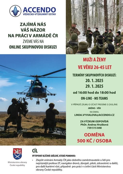 📣 ZVEME VÁS NA ONLINE SKUPINOVOU DISKUZI 💬 💵ODMĚNA: 500 KČ / OSOBA 🧔♂️👩🦰CÍLOVÁ SKUPINA ÚČASTNÍKŮ: MUŽI A ŽENY 26-45 let 🏷TÉMA: Práce v Armádě ČR 🪖, případně pro v civilní části Ministerstva obrany České republiky 🛡. 💻FORMA: ONLINE V PROSTŘEDÍ MS TEAMS 🗓TERMÍNY: 20. 1. 2025 od 🕓16:00 hod do 🕧18:00 hod 29. 1. 2025 od 🕓16:00 hod do 🕧18:00 hod 👍V PŘÍPADĚ ZÁJMU O ÚČAST PROSÍME O ZASLÁNÍ: JMÉNO - VĚK 📧NA EMAIL📧 LINDA.VYVIALOVA@ACCENDO.CZ ZA VÝZKUM ODPOVÍDÁ 👩🦰PhDr. Andrea Hrušková 📱739 515 848 TĚŠÍME SE NA VAŠI ÚČAST (fb)
