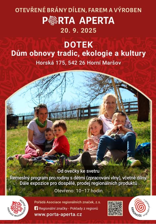 🐑Od ovečky ke svetru - tímto oblíbeným programem se zapojíme do celorepublikové akce Porta Aperta! 📆V sobotu 20. září můžete v našem krkonošském pracovišti Ekocentrum DOTEK zažít řemeslný program pro rodiny s dětmi. 👉Vyzkoušíte si celý proces zpravování vlny - od surové vlny až po hotovu přízi a svetr ☺️ K tomu vás čekají i tvořivé dílničky a interaktivní expozice Jak (pře)žít v přírodě a civilizaci. 📍Dům DOTEK, Horská 175, Horní Maršov Více informací najdete na webu Regionální značky - Poklady z regionů (odkaz v komentářích). Těšíme se na vás ☺️ #strediskosever #ekocentrumdotek #hornimarsov #regionalniznacky #tipnavylet #tipnavikend #krkonoseoriginalniprodukt (fb)