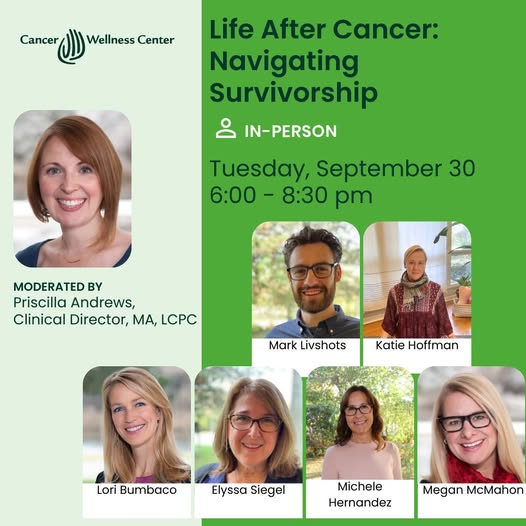 Join the Center for a meaningful evening focused on life after cancer. Hear welcoming remarks from Priscilla Andrews, Clinical Director, MA, LCPC, followed by expert-led breakout sessions on key topics, including: - Coping with Chemobrain - Breathwork for Stress Management - Nutrition After Cancer Treatment - Parenting Post Cancer - Navigating Intimate Relationships - Body Image & Self-Esteem Experience support, connection, and guidance on the importance of care in survivorship. Doors open at 5:30, and we would love to have you there. Click here to register: https://forms.gle/Qh69kDLmiXhWc2KZ8 #cancersurvivorship #lifeaftercancer #cancersupport (fb)