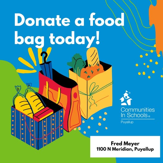Heading to the grocery store in the next couple of days? Be sure to pick up one of our donation bags at Fred Meyer downtown (1100 N Meridian, Puyallup) to support the Backpack Buddies Weekend Food Bag Program! Every bag helps ensure students in our district have nutritious meals to get them through the weekend until Monday. #allinforkids #beingpresentmatters #cispuyallup #fredmeyer (fb)