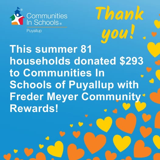 💙 This summer, 81 households donated $293 to Communities In Schools of Puyallup through the Fred Meyer Community Rewards program! A huge thank-you to @fredmeyerstores and everyone in our community who made this possible! 🙌 If you haven’t already, you can link your Rewards Card to Communities In Schools of Puyallup online or in the Rewards Card app—it’s an easy way to give back just by shopping! 🛒💫 #BetterTogether #CISPuyallup #CommunitySupport #FredMeyer (fb)