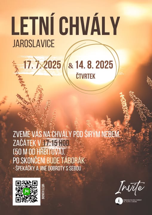 Zveme Vás již na 2. letní chvály pod širým nebem a to ve čtvrtek 14. 8. 2025 v Jaroslavicích🤩 začátek v 17:15 hod. Těšíme se na Vás! (fb)