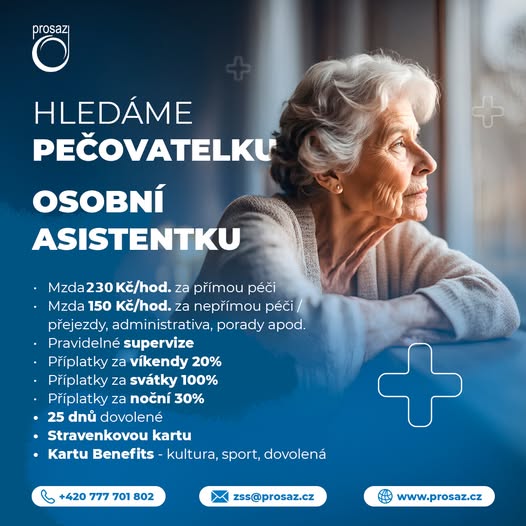 🔎 Hledáme osobní asistentku/pečovatelku! ❤️ Hledáme spolehlivou a empatickou osobní asistentku/pečovatelku, která by se připojila k našemu týmu a pomáhala lidem, kteří potřebují podporu v každodenním životě. 📩 Máte zájem nebo víte o někom, kdo by se hodil? Napište nám do zpráv nebo na e-mail: zss@prosaz.cz . Děkujeme za sdílení! 🙏😊 (fb)