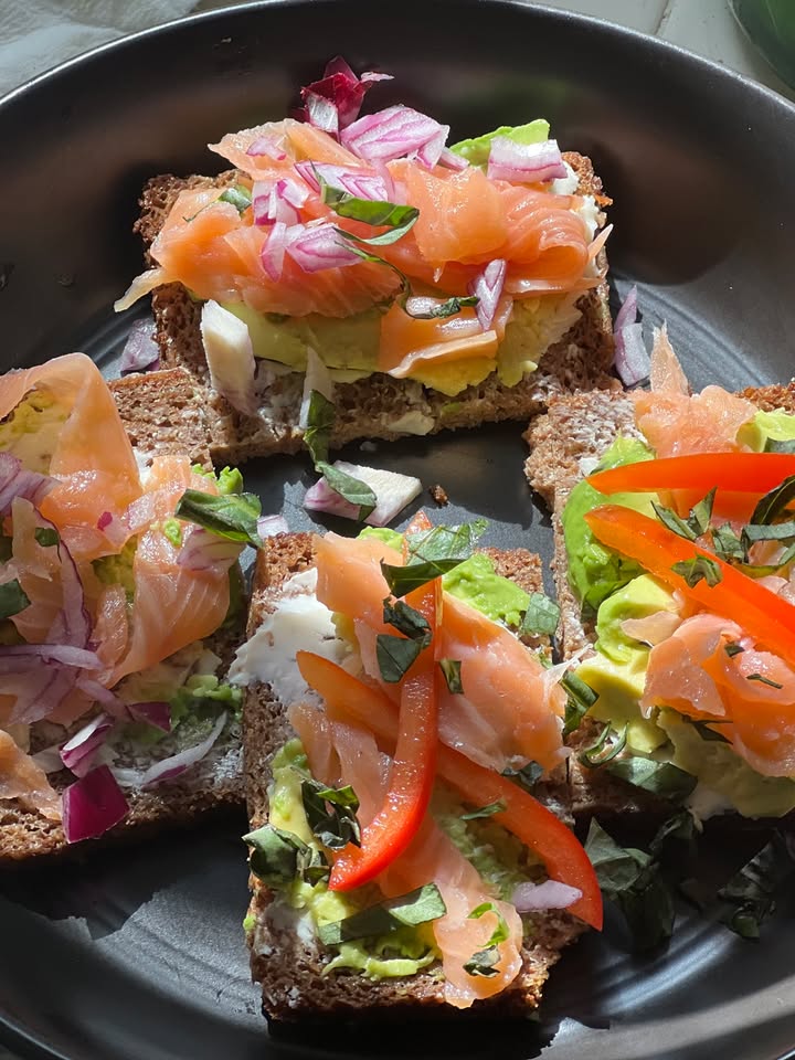 One of my student's projects is researching other cultures' cuisines. One student chose the cuisine of Norway and their smørrebrød. "A traditional open-faced sandwich in the cuisines of Denmark, Norway, and Sweden that usually consists of a piece of buttered rye bread, topped with commercial or homemade cold cuts, pieces of meat or fish, cheese or spreads, and garnishes." The rye bread is very thinly sliced. Some of them are works of art! These examples are simple. (fb)