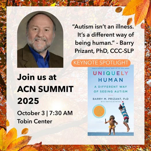 🍂 ICYMI! Online registration for ACN Summit 2025 closes tomorrow at noon — including scholarship applications. ⏰ 🎟️ Miss the deadline? A limited number of tickets and scholarships will be available at the door on October 3 at the Tobin Center. 🌟 We’re thrilled to welcome keynote speaker Barry Prizant, PhD, CCC-SLP, author of Uniquely Human. 👉 Explore his work and podcast at uniquelyhuman.com Secure your spot now: bit.ly/ACNSummit2025 #ACNSummit2025 #Neurodiversity #BIGFutures #UniquelyHuman #SanAntonioEvents (fb)
