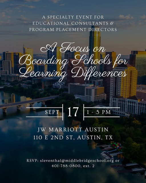 📍 Austin, TX We’re thrilled to invite educational consultants and program placement directors to a special event focused on boarding schools for students with learning differences. 🗓 September 17 🕐 1–5 PM 📍 JW Marriott Austin Join us for meaningful conversations, networking, and insight into programs designed to support neurodiverse learners. 📩 RSVP to sleventhal@middlebridgeschool.org or call 401-788-0800 ext. 2 #BoardingSchools #LearningDifferences #AustinEvents (fb)