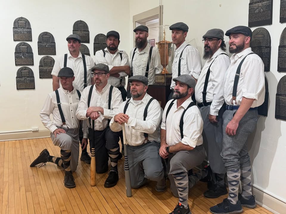 The Mesa Miners joined us today at the Mesa Historical Museum for the unveiling of the Capstone Copper Trophy, which they won in a thrilling ten-inning game against the Globe Bears at the inaugural Arizona Vintage Base Ball League Championship in April. The Mesa Miners are part of the Arizona Vintage Base Ball League, a group dedicated to playing 19th-century-style baseball using historic rules, uniforms, and equipment. The trophy is now on display at the museum before it travels back to Globe for next year’s contest. Stop by to take a look! (fb)
