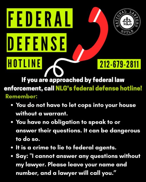 NLG is receiving more and more verified reports of federal agent door-knocks and contacts. If you are approached by federal law enforcement, don’t be afraid to alert your community, and remember: You do not have to let them into your house without a warrant. You have no obligation to speak to law enforcement or answer their questions, and it can be dangerous to do so. It is a crime to lie to federal agents. Instead, you can invoke your Fifth Amendment right to remain silent, and your Sixth Amendment right to counsel, by saying “I cannot answer any questions without my lawyer. Please leave your name and number, and a lawyer will call you.” You can also call the National Lawyers Guild federal repression hotline at 212-679-2811, for a free, privileged consultation about your rights, risks, and responsibilities, and to be connected with appropriate legal resources in your jurisdiction. We keep us safe! (fb)